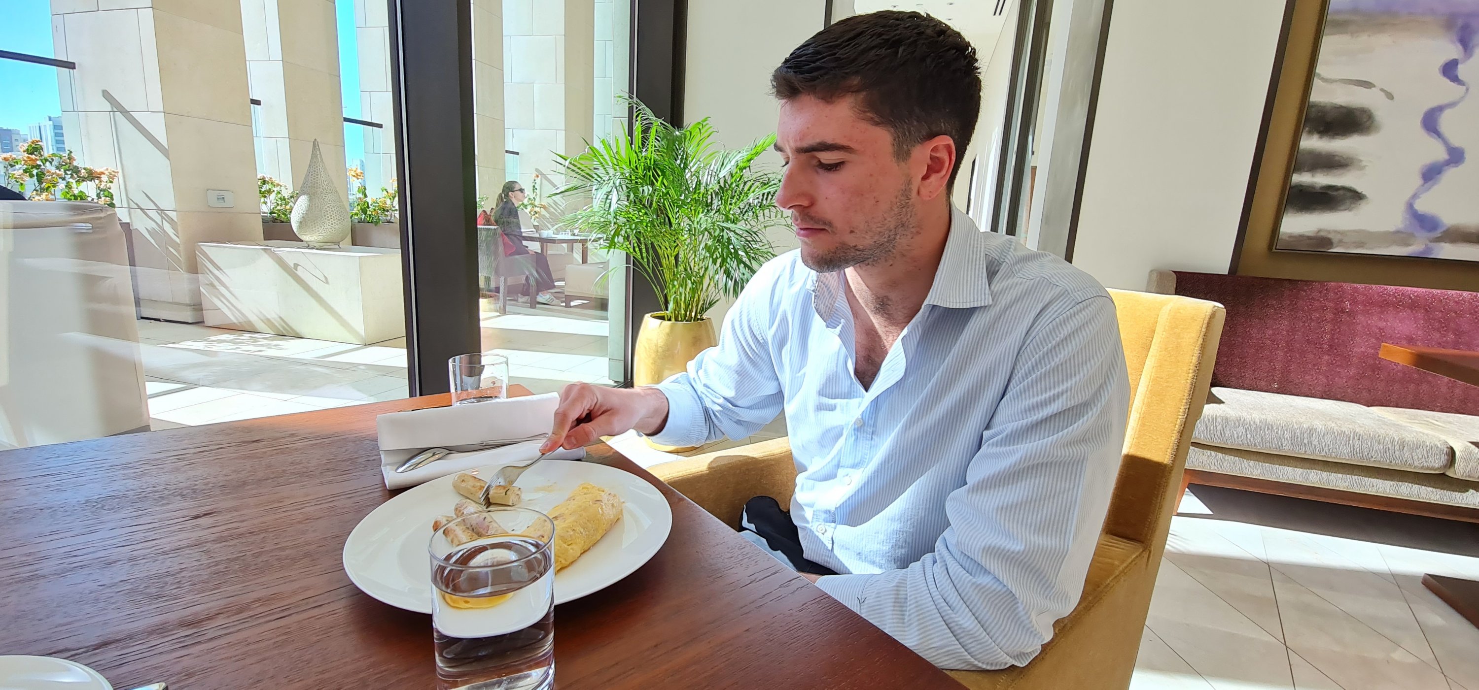 Todo viaje comienza.con un primer paso y este es el desayuno. Manu tiene el típico nerviosismo del viaje y no sabe qué llevar en la maleta. Nos vamos 5 días. Nuestro segundo viaje internacional juntos. Estaremos en DOHA en el WISE el evento de educación innovación más importante del mundo. Nos falta Inés. Pero estará con nosotros todo el viaje.